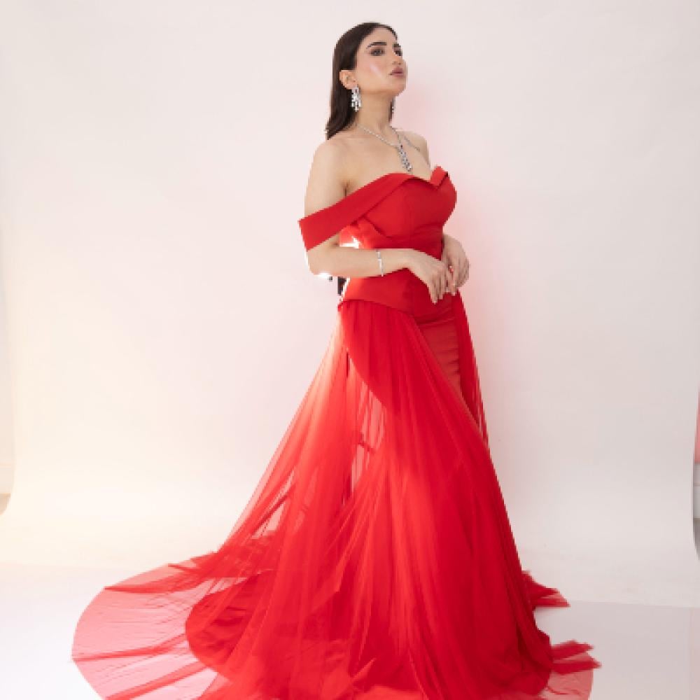 مواصفات فستان سهرة احمر طويل