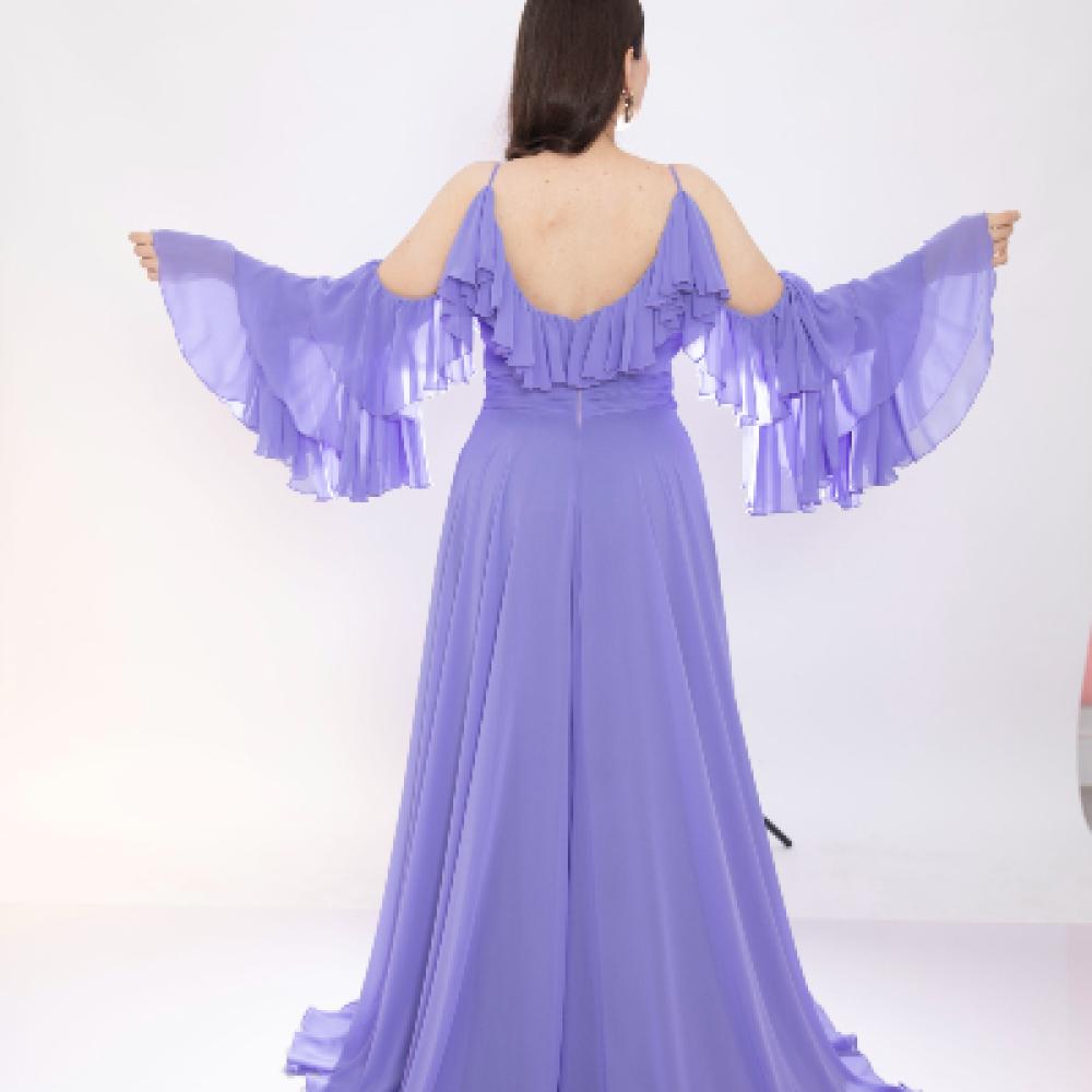- يتميز الفستان بالقماش الشيفون المبطن ذات اللون القوي لأضافة مظهرًا جذاب وقوي مع تفاصيل الأكمام المنفوش ذات طبقات واسعة، والتي تضيف لمسة من التميز والفخامة، كما يأتي الفستان على شكل درابيه من الصدر وحتى الخصر ويتدلى بشكل انسيابي حتى النهاية لتبرز القصة شكل الخصر لتعطي مزيدا التناسق.