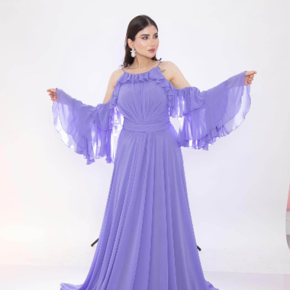 - صُمم الفستان بقماش شيفون عالي الجودة وتبرز قصة الكتف ذات الفتحات لمسة من الجاذبية.